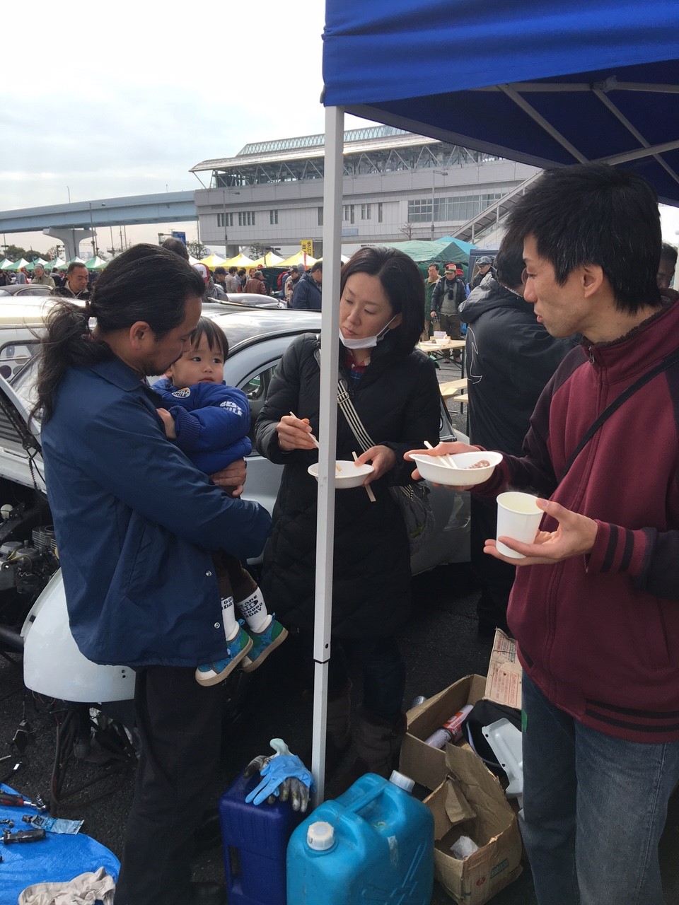 ニューイヤーの朝は早いです。 設営組は6時前に入場し、 テント・机・イス等を準備しました。 |