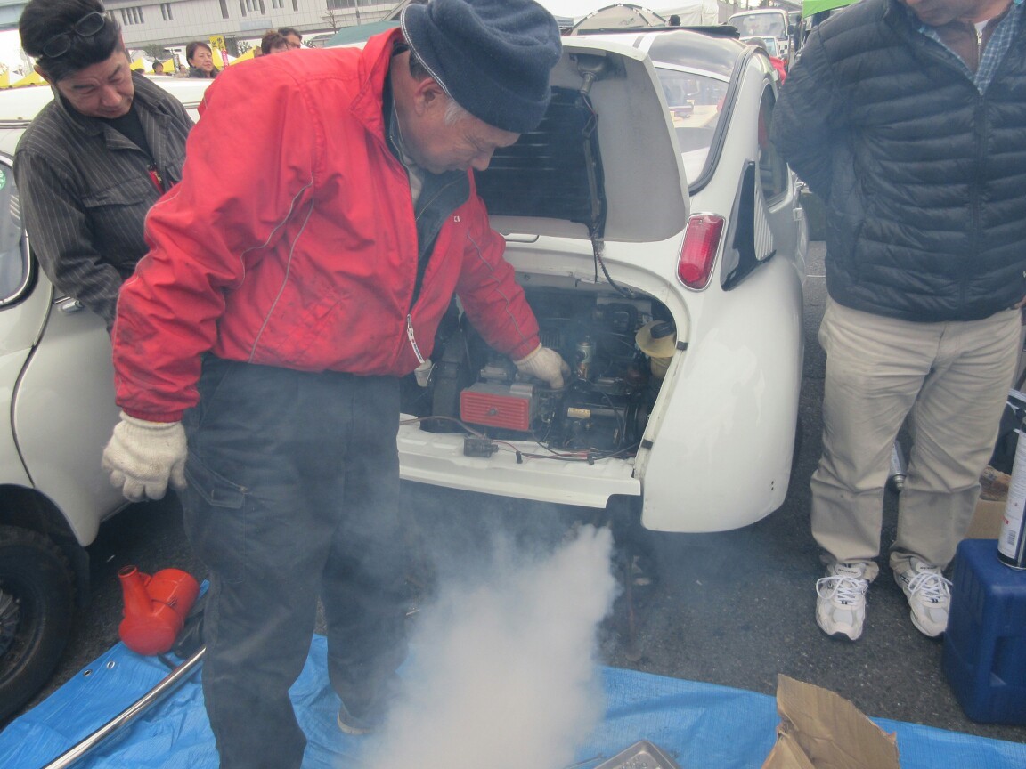 点火!! ものすごい白煙を吐きましたが、 いとも簡単に再始動できました。 ギャラリーからも拍手喝采を受けました。 |